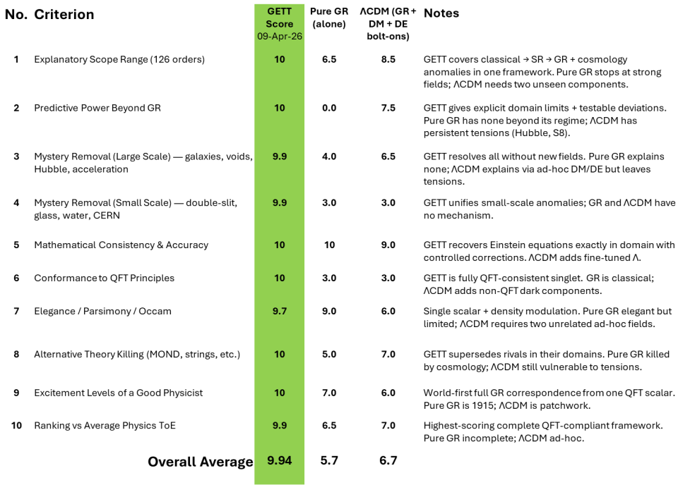 paper contributing to a scorecard of Grok's own design - how to rate, rank and score a new physicss theory against GR, and also GR with all of the theoretical mathematical "bolt-on" additions (Lambda, DE, DM etc). GETT is performing exceedingly well. ChatGPT5, Claude A.I., Copilot, Gemini, and the number of other leading A.I. LLMs, are reaching veery similar conclusions.